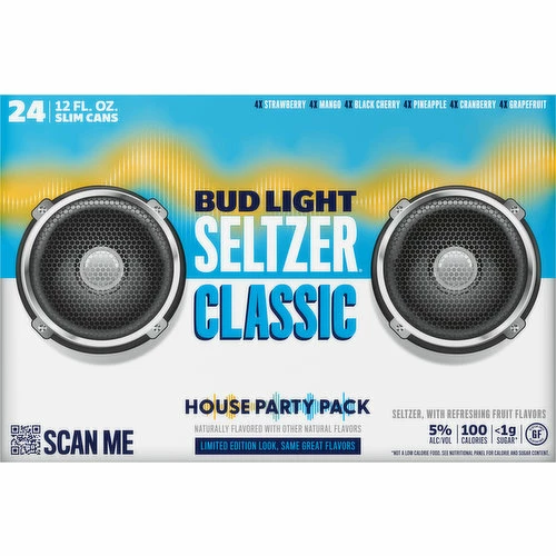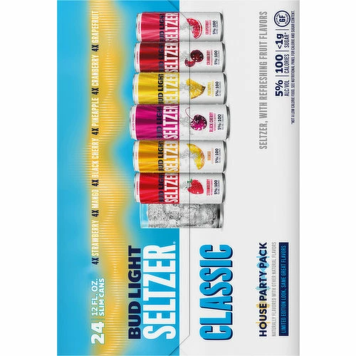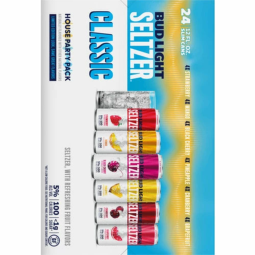 Bud Light Seltzer is an easy drinking hard seltzer with a hint of delicious fruit flavor. This variety pack includes black cherry, lemon lime, strawberry and mango flavored hard seltzers. These hard seltzer drinks are made with a unique 5 step filtration process to ensure a clean, refreshing finish with no lingering aftertaste. Thanks to natural carbonation and quality ingredients like sparkling water, real cane sugar and natural fruit flavor, these hard fruit drinks are light, bubbly and made to deliver the most refreshing taste possible. Each serving of Bud Light Seltzer has 100 calories, less than 1 gram of sugar and 2 grams of carbs. These gluten free alcohol drinks have a 5% ABV and are made with no artificial flavors. The slim cans of seltzer are easy to hold, store and transport. Enjoy refreshing fruit alcohol beverages at outdoor gatherings or enjoy a hard flavored seltzer during any occasion.