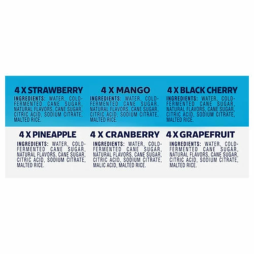 4x Strawberry: Water, Cold-Fermented Cane Sugar, Natural Flavors, Cane Sugar, Citric Acid, Sodium Citrate, Malted Rice. 4x Mango: Water, Cold-Fermented Cane Sugar, Natural Flavors, Cane Sugar, Citric Acid, Sodium Citrate, Malted Rice. 4x Black Cherry: Water, Cold-Fermented Cane Sugar, Natural Flavors, Cane Sugar, Citric Acid, Sodium Citrate, Malted Rice. 4x Pineapple: Water, Cold-Fermented Cane Sugar, Natural Flavors, Cane Sugar, Citric Acid, Sodium Citrate, Malted Rice. 4x Cranberry: Water, Cold-Fermented Cane Sugar, Natural Flavors, Cane Sugar, Citric Acid, Sodium Citrate, Malted Rice. 4x Grapefruit: Water, Cold-Fermented Cane Sugar, Natural Flavors, Cane Sugar, Citric Acid, Sodium Citrate, Malted Rice.