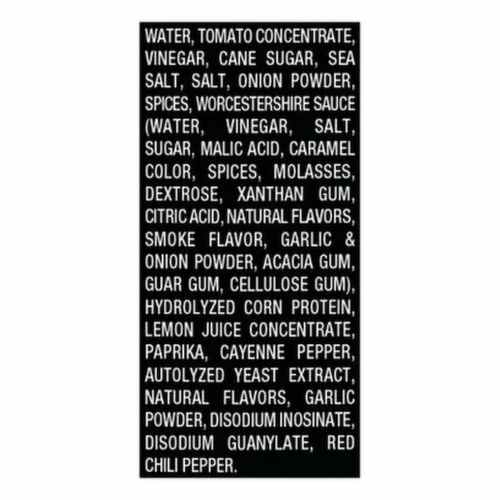Water, Tomato Concentrate, Vinegar, Cane Sugar, Sea Salt, Salt, Onion Powder, Spices, Worcestershire Sauce (Water, Vinegar, Salt, Sugar, Malic Acid, Caramel Color, Spices, Molasses, Dextrose, Xanthan Gum, Citric Acid, Natural Flavors, Smoke Flavor, Garlic & Onion Powder, Acacia Gum, Guar Gum, Cellulose Gum), Hydrolyzed Corn Protein, Lemon Juice Concentrate, Paprika, Cayenne Pepper, Autolyzed Yeast Extract, Natural Flavors, Garlic Powder, Disodium Inosinate, Disodium Guanylate, Red Chili Pepper.