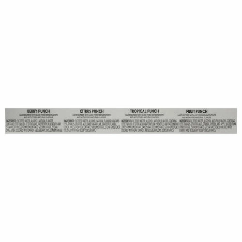 Berry Punch: Filtered Water, Alcohol, Natural Flavors, Contains Less than 2% of Citric Acid, Raspberry, Blueberry, and Strawberry Juices from Concentrate, Sodium Citrate, Stevia Sweetener, Colored with Carrot & Blueberry Juice Concentrates. Citrus Punch: Filtered Water, Alcohol, Natural Flavors, Contains Less than 2% of Citric Acid, Cane Sugar, Lime, Grapefruit, and Lemon Juices from Concentrate, Sodium Citrate, Stevia Sweetener, Colored with Pear Juice Concentrate. Tropical Punch: Filtered Water, Alcohol, Natural Flavors, Contains Less than 2% of Citric Acid, Watermelon, Pineapple, and Passionfruit Juices from Concentrate, Cane Sugar, Sodium Citrate, Stevia Sweetener, Colored with Pear, Carrot, and Blueberry Juice Concentrates. Fruit Punch: Filtered Water, Alcohol, Natural Flavors, Contains Less than 2% of Citric Acid, Orange, Cherry, and Apple Juices from Concentrate, Sodium Citrate, Stevia Sweetener, Colored with Carrot and Blueberry Juice Concentrates.
